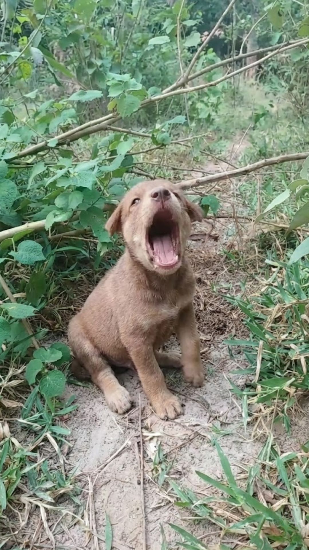 I followed the sound away from the trash, deeper into the dense forest nearby. There, huddled in the dirt and completely alone, was a tiny puppy.