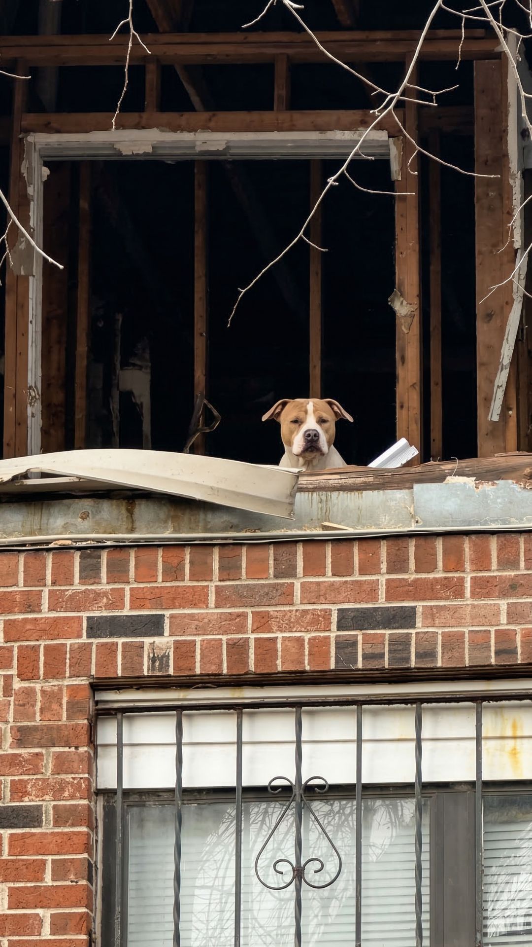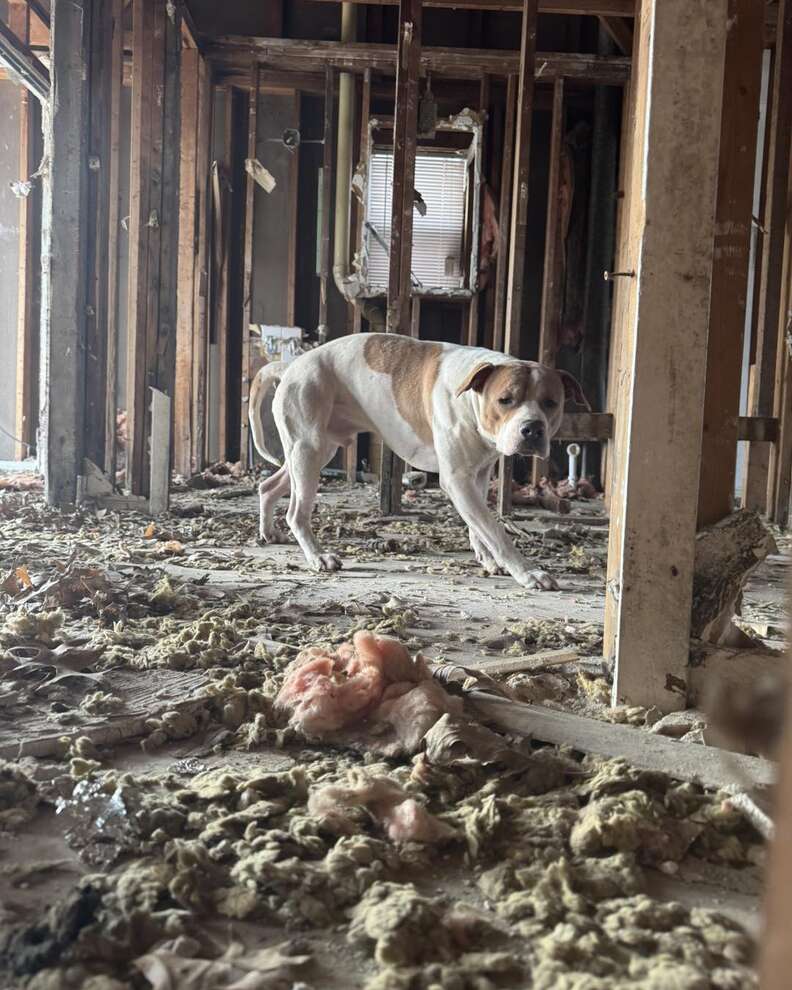 High up on the second story of a dilapidated, abandoned house, a brown-and-white pit bull sat shivering. There were no walls left to protect him from the whipping winds. The steep, rubble-covered staircase he had somehow climbed up had become a terrifying trap.