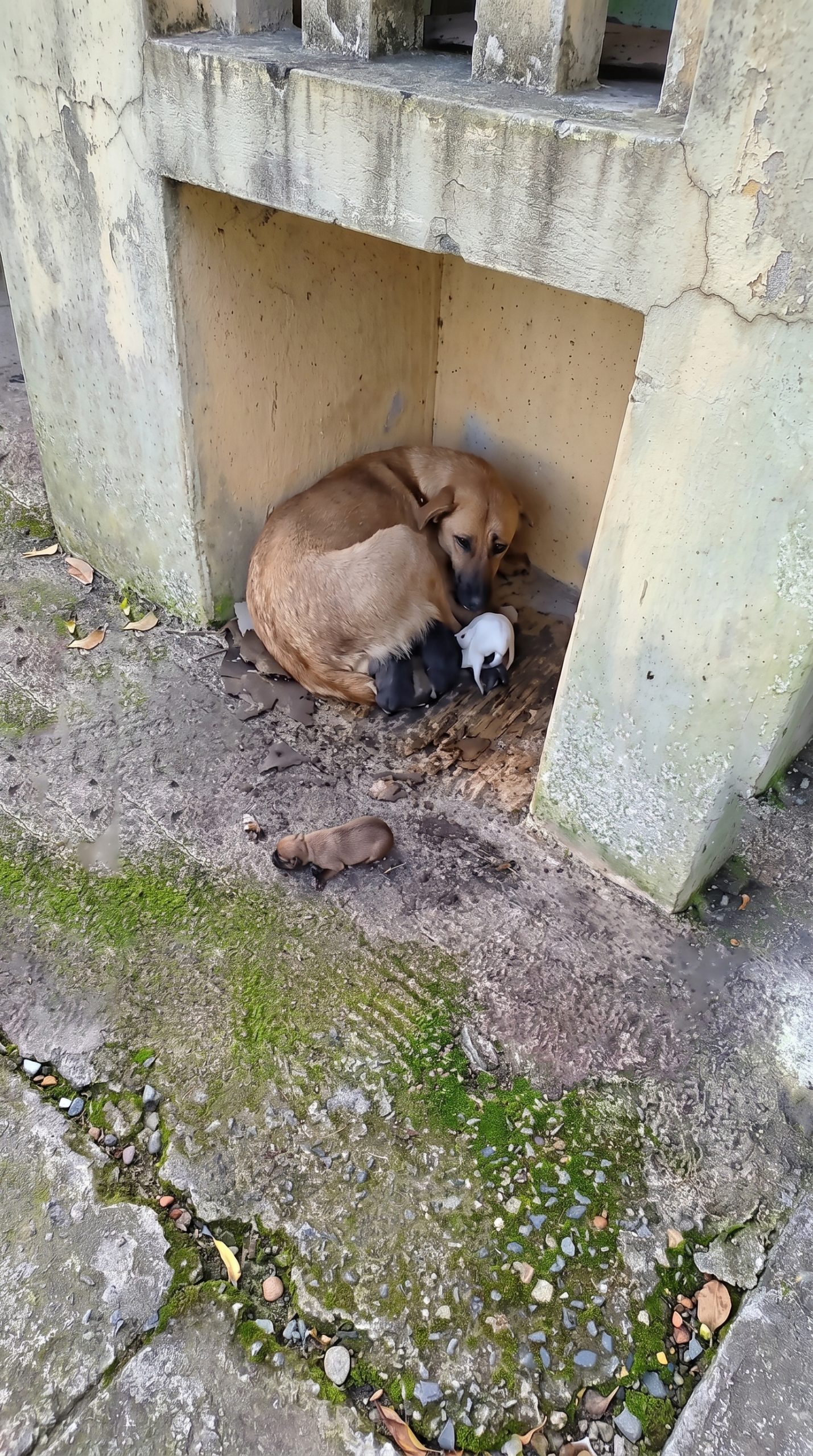 The abandoned dog had already endured the agonizing process of giving birth completely on her own in the freezing dirt.