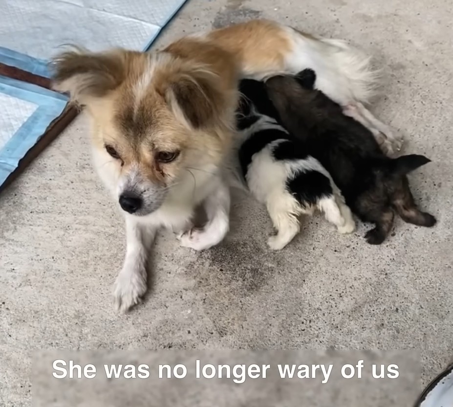 She wanted to run, but then, she heard the familiar, soft sounds coming from their transport cage. The team had brought her puppies back, using their presence to show her they were perfectly safe.