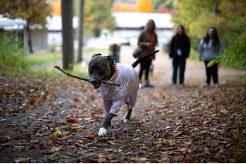 Instead of forcing awkward eye contact or trying to think of conversation starters, the students can focus on the dog. It’s much easier to laugh at whatever cute thing Leo is doing in the woods.