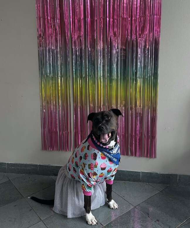 She was dressed for a very special occasion. She wore a sparkly tutu, a cupcake-themed onesie, a beaded collar, and a delicate pink crown.