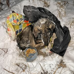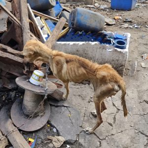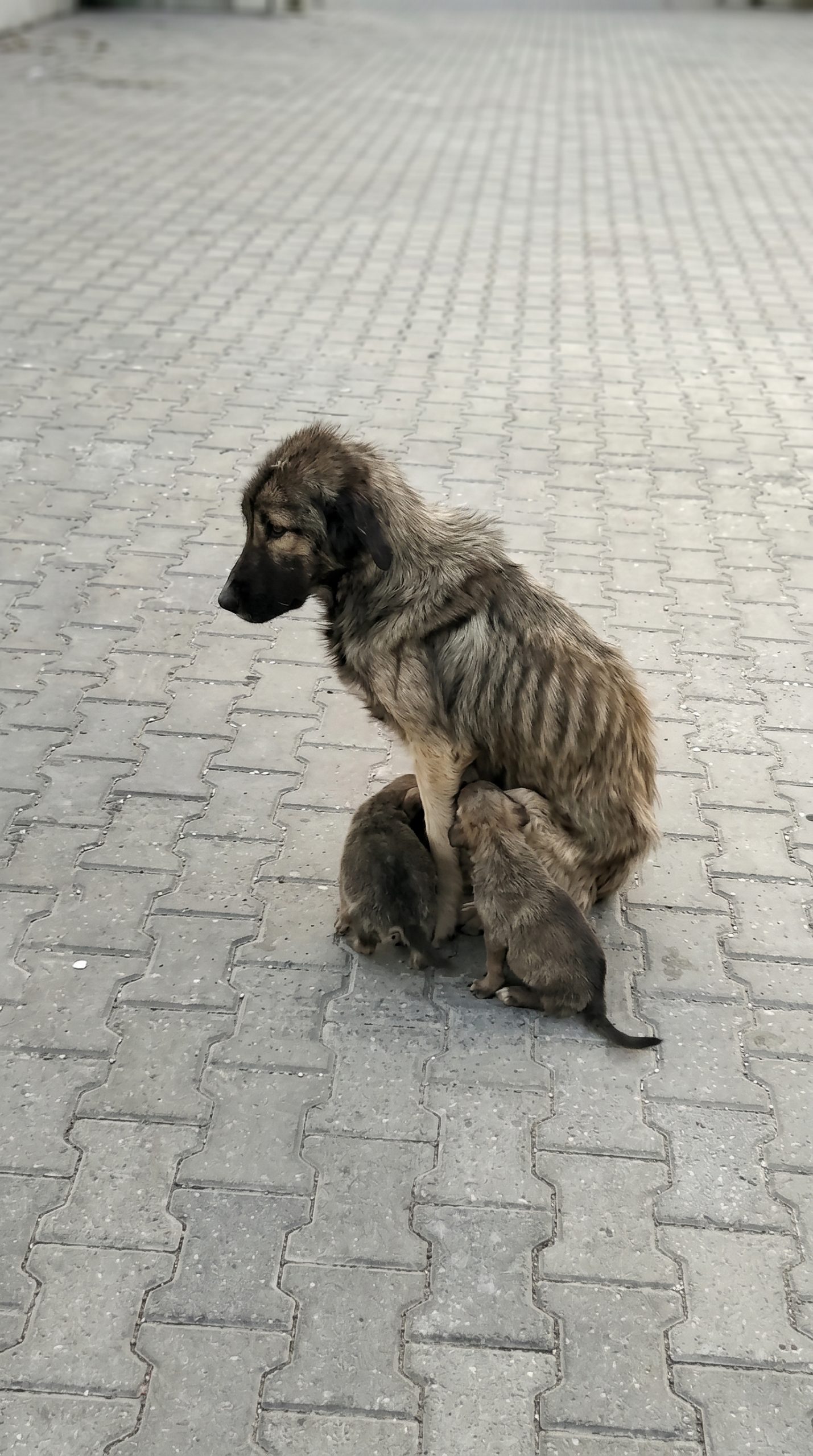 A severely emaciated dog cowered deep in the shadows, her paper-thin skin barely concealing her sharp, jutting ribs as she tightly curled around her tiny litter.