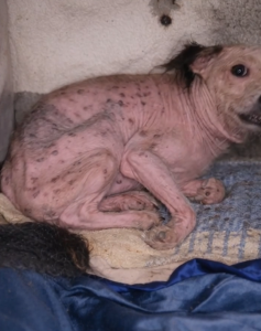 The next morning, we went straight to the vet. Seeing him in the light was even harder. At 14 pounds, he was basically a skeleton with a heartbeat. He was covered in mange and fleas, and his blood was being attacked by a nasty parasite.