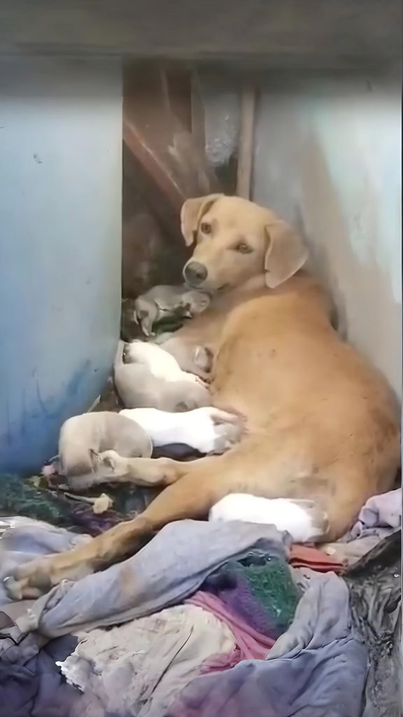 The small, abandoned house sat quietly, as the rescue team moved with purpose inside, the air thick with the gravity of what awaited them. In the corner of the room lay a heartbreaking sight: a frail mother dog, her body thin and trembling, protecting her newborn puppies. Her ribs were visible beneath her matted, dull fur, and exhaustion poured from her fragile frame. Yet, despite her evident suffering and weariness, Vera’s posture remained firm—she was determined to stay strong for her babies.