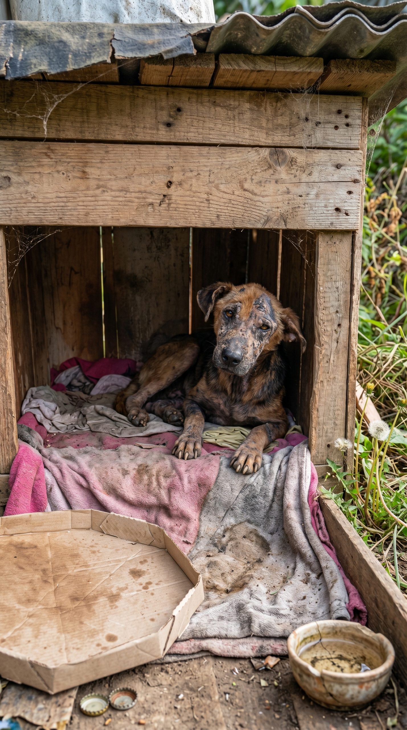 Huddled amidst the charred debris was a frail silhouette, his inflamed skin stripped bare and heavily crusted by relentless, unchecked neglect.