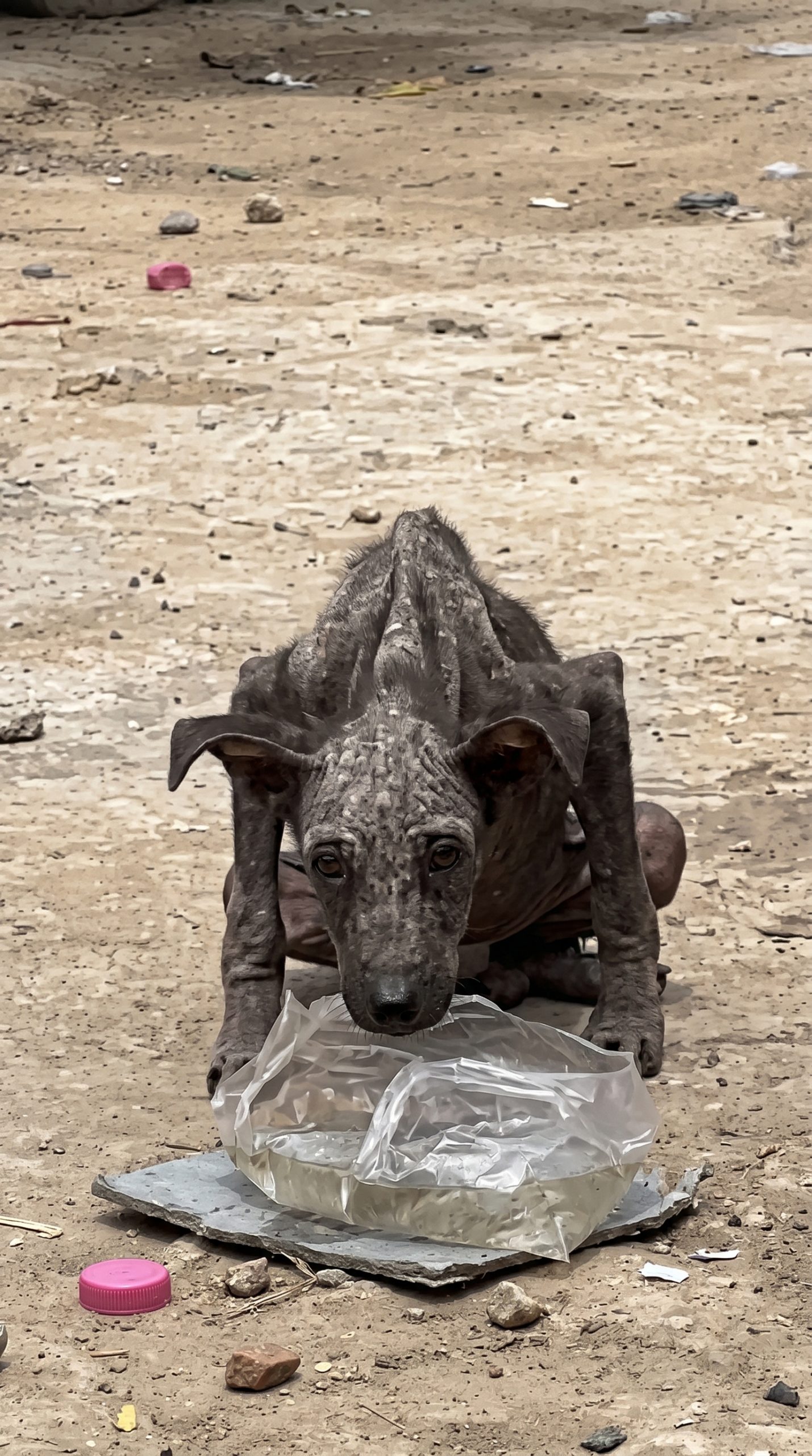 Wedged tightly between rotting bags was a dog so terribly emaciated his spine looked like a fragile ridge of stones, trembling violently at the mere crunch of gravel.