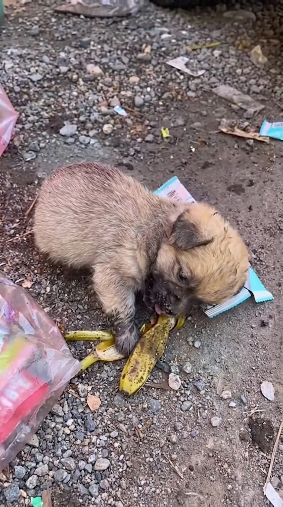 He was too weak to cry, yet too hungry to give up. With what little strength remained, he crawled through the refuse, searching for anything to fill the void in his stomach. When he finally found a half-eaten, discarded sausage, his tiny face lit up with a heartbreaking glimmer of joy. To him, that piece of trash was the best meal of his life.