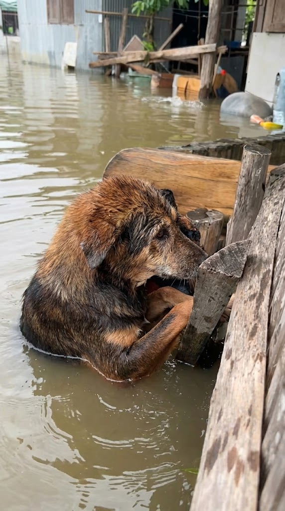 In the heart of a submerged district, rescuers navigated their boat through what used to be a neighborhood. Everything was underwater. Amidst the floating debris and shattered fences, they spotted a small, dark shape. It was a dog, pinned against a wooden barrier by the sheer force of the water.