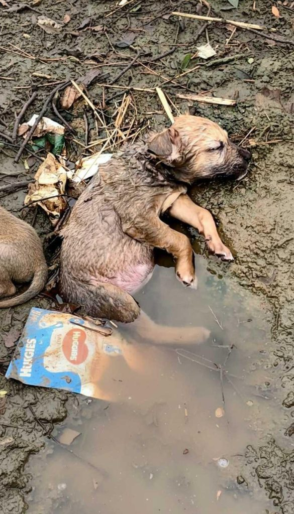 Realizing the gravity of the situation, the passerby immediately alerted a local rescue group. However, the mission took a terrifying turn when the volunteers arrived at the site. The ditch was empty. Panic surged through the team—had the rising water swept him into the drainage pipes? Had he used his final ounce of strength to wander into the path of airport traffic? Just as hope began to evaporate, a volunteer spotted a flash of matted fur. The puppy was lying motionless, partially submerged and nearly invisible against the mud. He was fading fast, his life slipping away in the silence of the ditch.