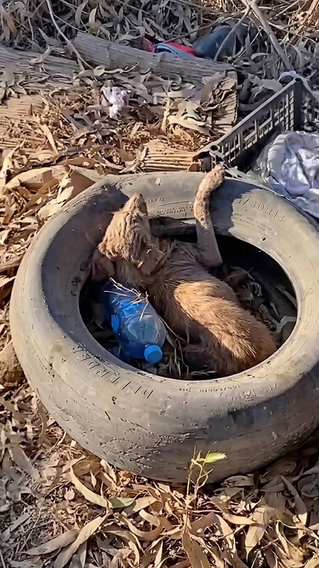 The tire became her entire world. It was her shield against the cold nights. It was the only home she knew while she waited—hungry, terrified, and heartbroken—for a kindness that might never arrive.