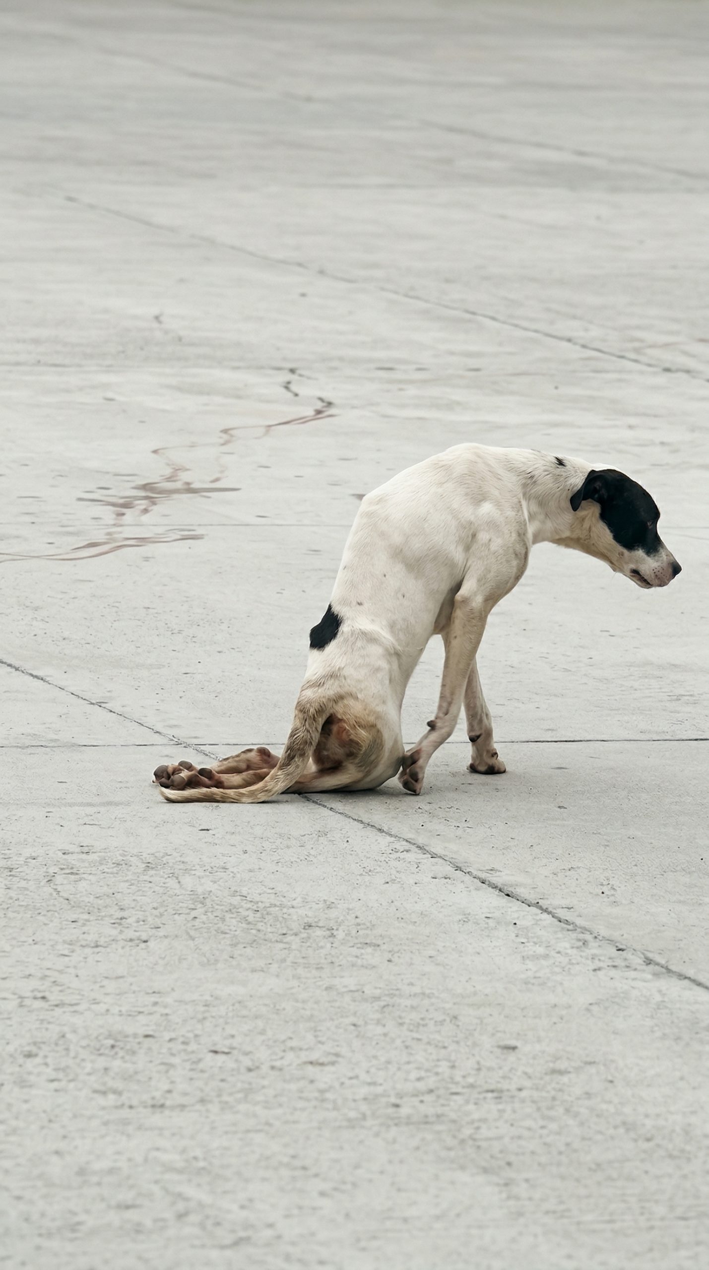 Up ahead, a dog was dragging herself across the rough cement.