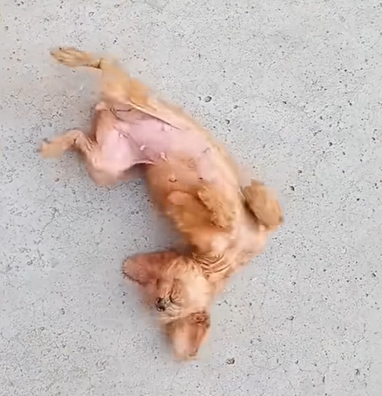 It began with a casual observation near the garbage bins. A young woman noticed something picking through the trash—not a bird or a stray cat, but a dog so emaciated it looked like a hollow shell of skin and bones. It was a Poodle, or what was left of one, trembling so violently it could barely stand. When a man approached and offered a piece of chicken jerky, the dog’s hunger was so primal that it forgot to be afraid. It simply ate, driven by a desperate will to survive.