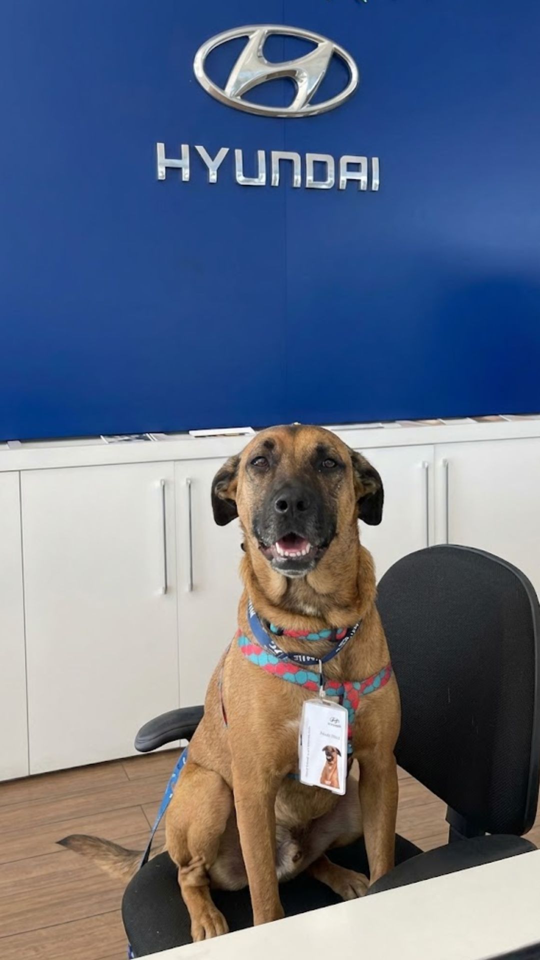 The stray was officially adopted and named Tucson Prime, after the dealership’s most popular SUV. But Tucson wasn’t just going to be a pet; he was given an official employee badge and “hired” as a car consultant.