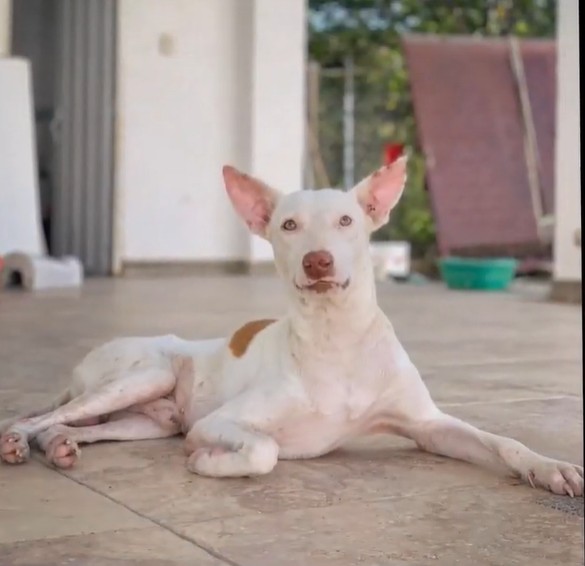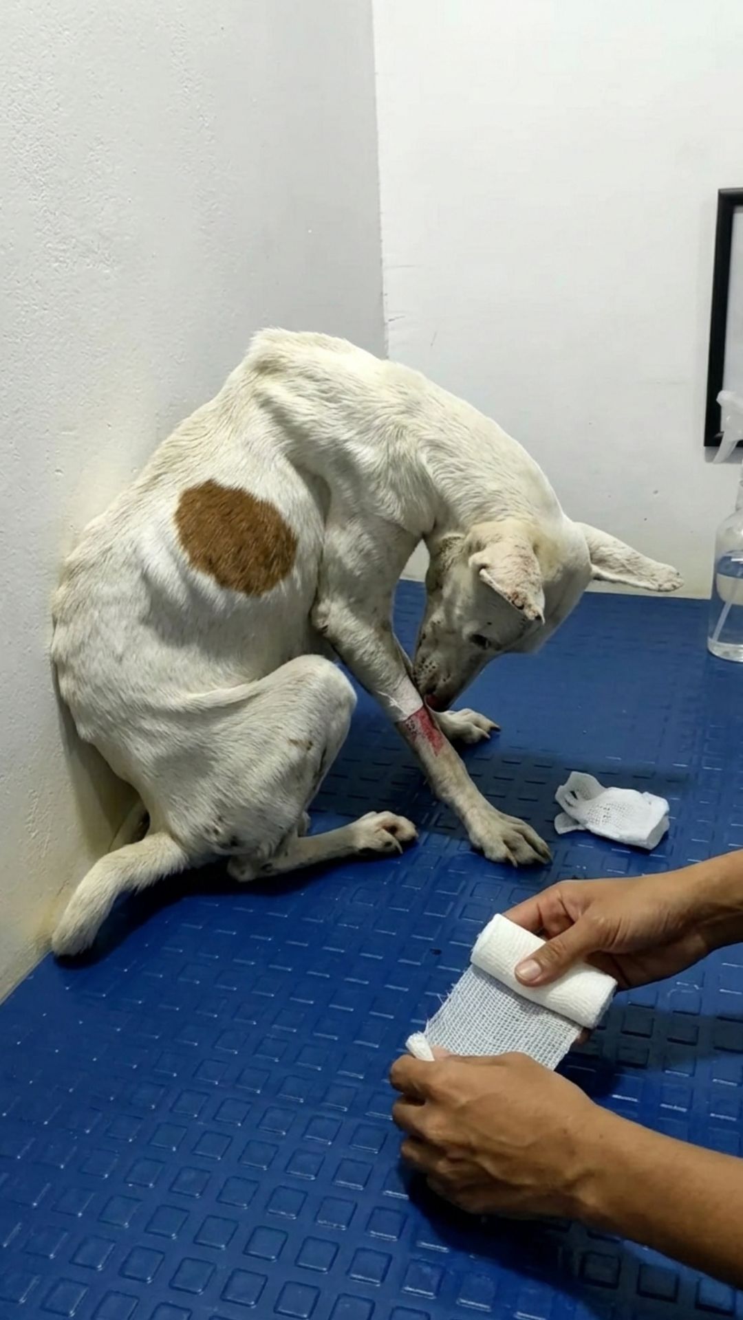 Standing on the side of the road was a creature that looked more like a ghost than a living dog. He was so emaciated that every bone in his body seemed to be fighting to break through his skin. He looked starved, exhausted, and utterly defeated.