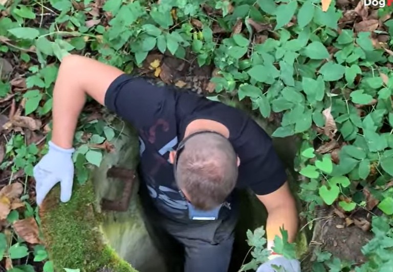 Hidden among the trees was a deep, vertical drainage pipe. Looking down into the abyss, he saw the terrified eyes of a trapped dog staring back up at him.