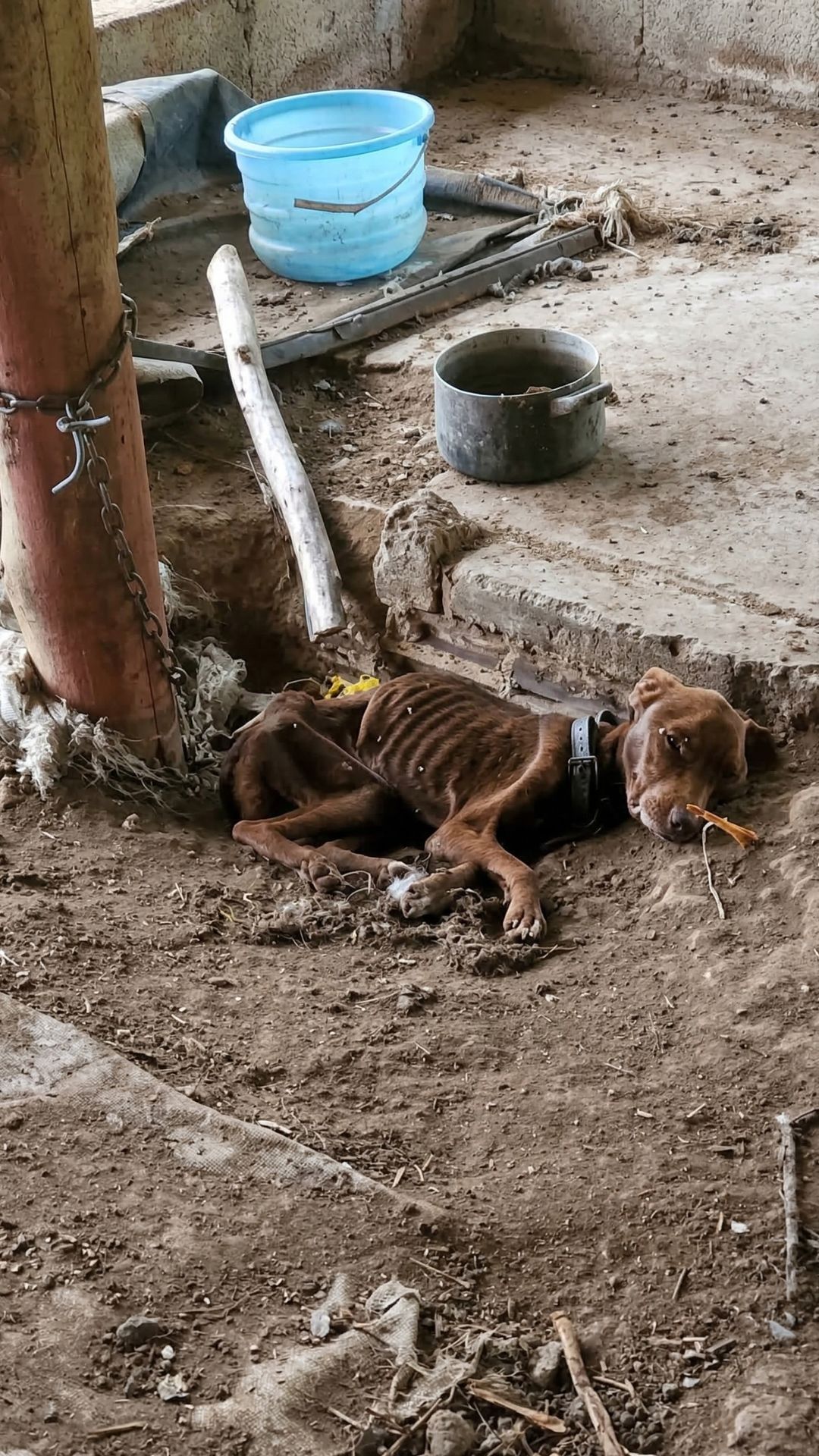 When the rescuers arrived with the police, they didn’t find a dog. They found a shadow. Bono was literally skin and bones, a fragile frame of a creature who had forgotten the strength of his own legs. He lay in the dirt, surrounded by a silence that spoke of weeks without a single drop of water or a morsel of food.