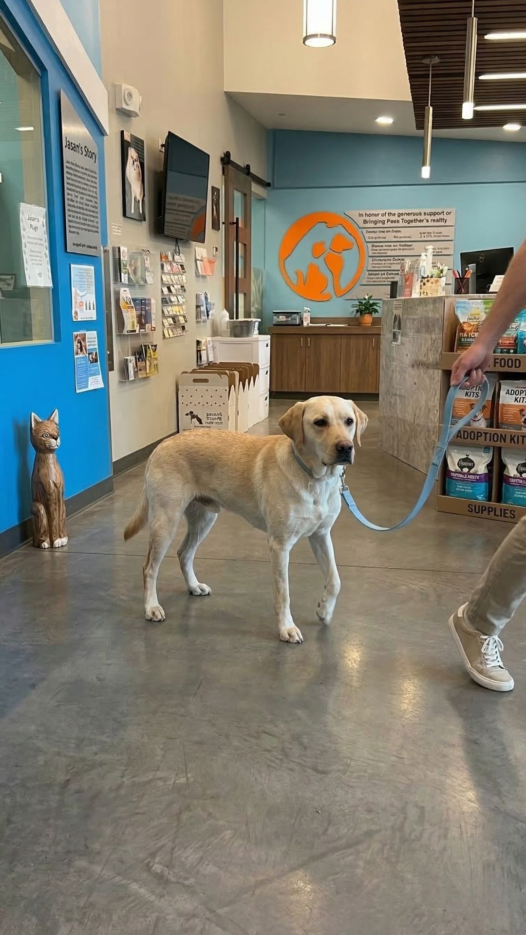 That afternoon, Banjo didn’t have to walk back to a cold kennel. Instead, he proudly walked out the front glass doors by his mother’s side.