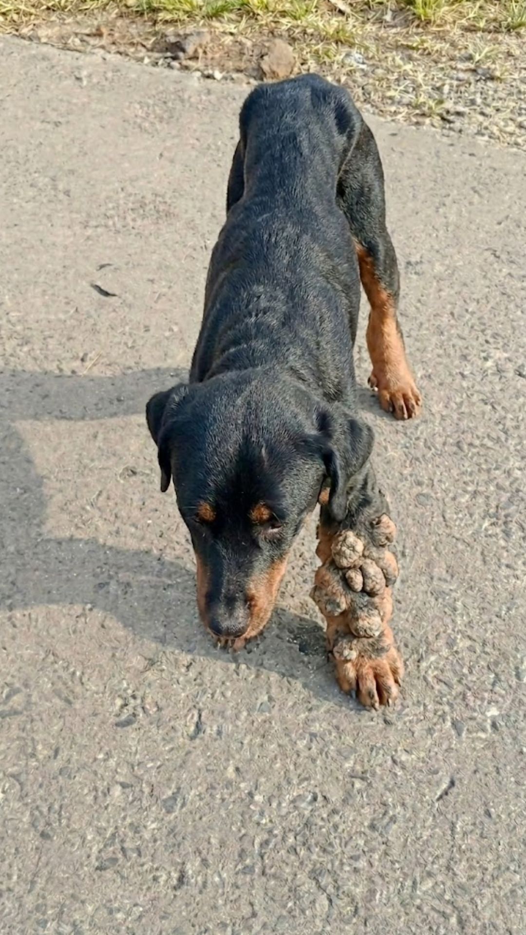 His front right leg had swollen to a monstrous size—heavy, throbbing, and completely useless. Every step he took was a grueling battle against gravity. He walked for miles on three healthy legs, dragging the massive, cancerous weight behind him, limping from house to house in search of a single scrap of food to stay alive.