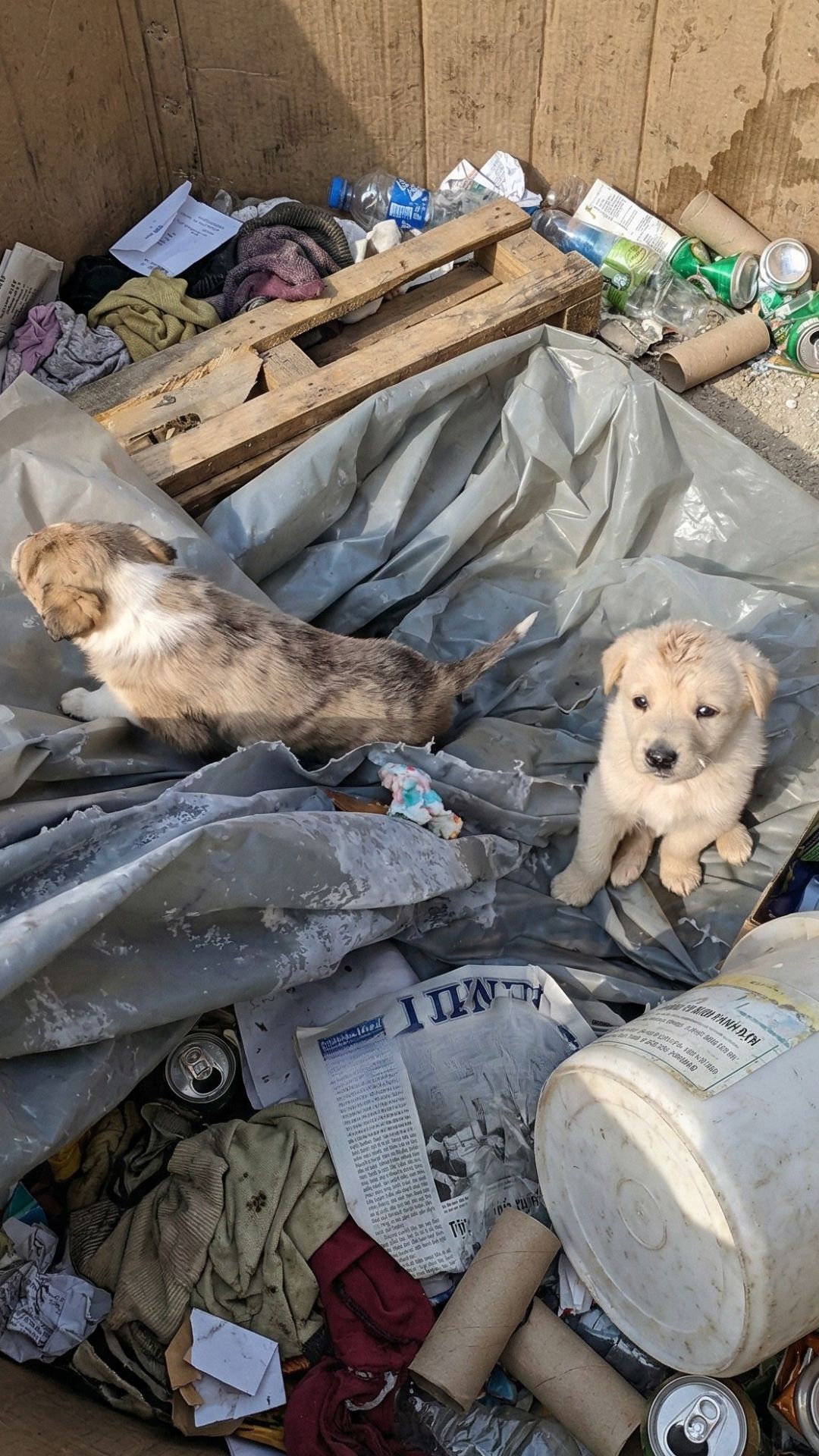 Two puppies, barely old enough to understand the world, were sitting in the dust.