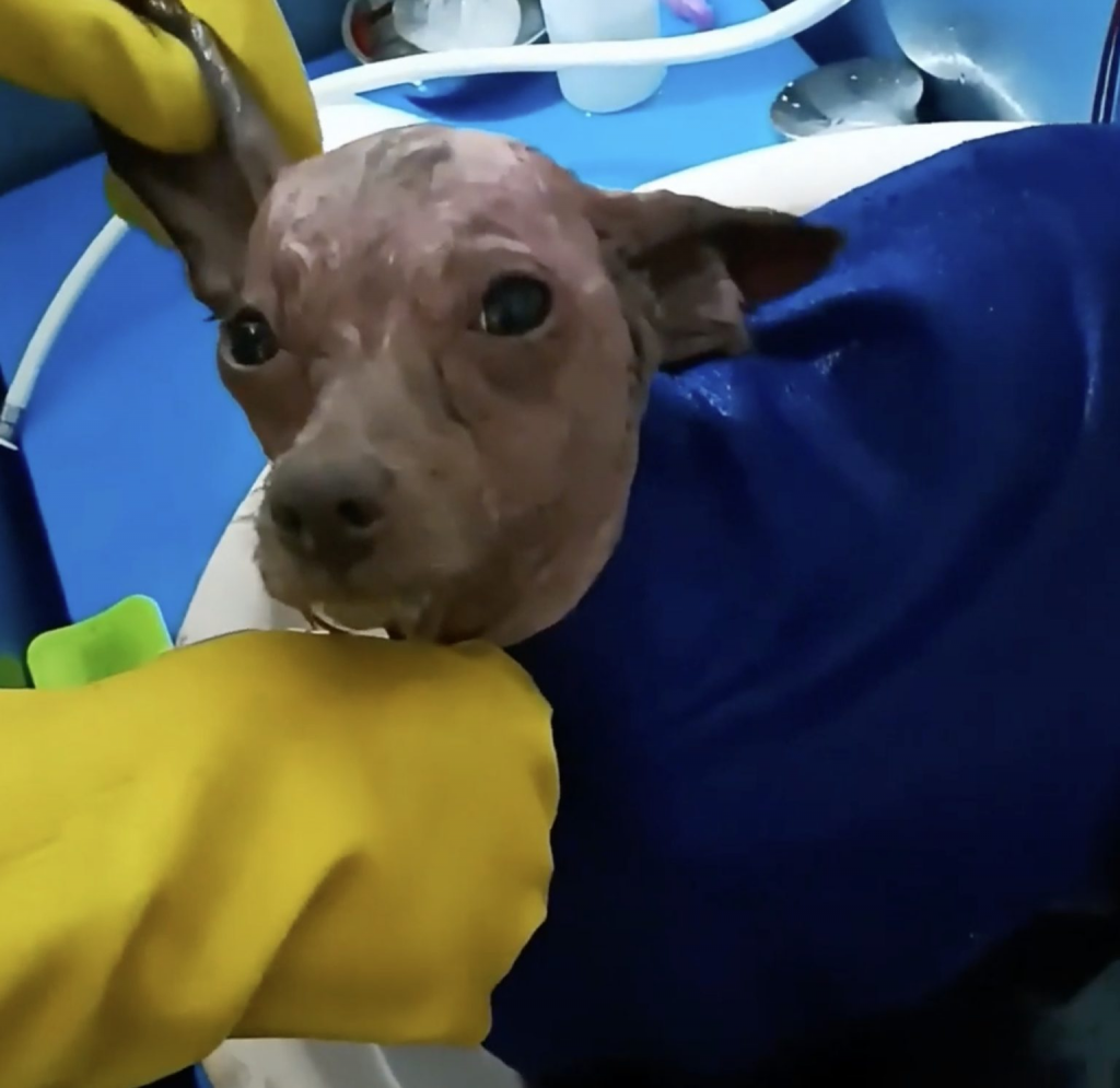 At the clinic, the staff immediately understood how serious his condition was. They began with a warm, medicated bath, allowing the water to wash away layers of dirt, infection, and pain. Remarkably, the dog remained still. He didn’t resist. It was as if he sensed that this time, the hands touching him meant safety. Volunteers spoke softly, offering comfort as the water eased both his skin and his fear.