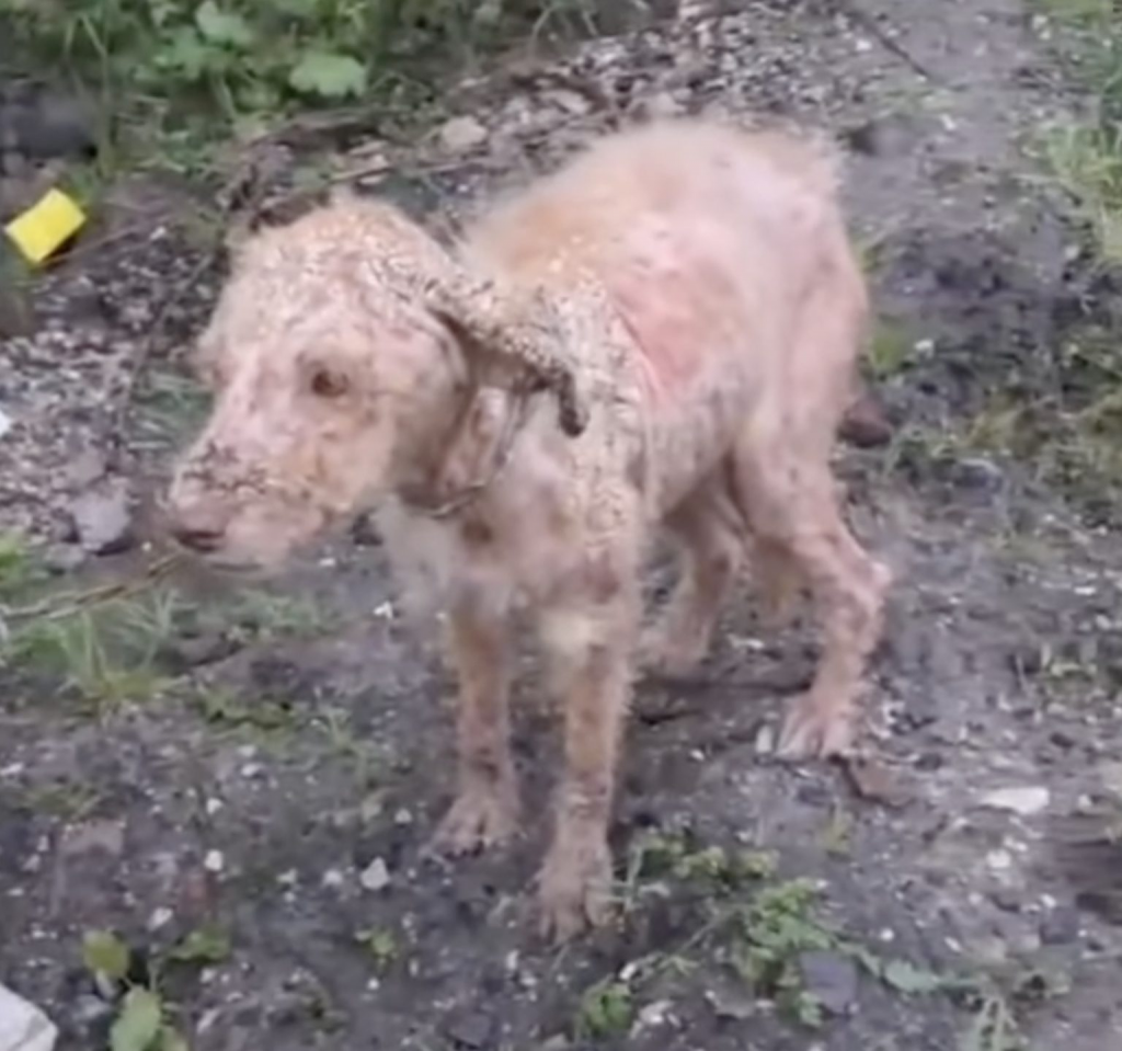 As time passed, her body began to reflect the cruelty of her circumstances. A severe skin condition slowly took over, causing relentless itching and pain. Large patches of fur fell away, leaving inflamed, cracked skin exposed to the elements. Mange spread unchecked, a clear sign of prolonged neglect. Her frame grew thinner with each passing day, her ribs clearly visible beneath fragile skin. This wasn’t a temporary hardship — it was a life deprived of even the most basic care.