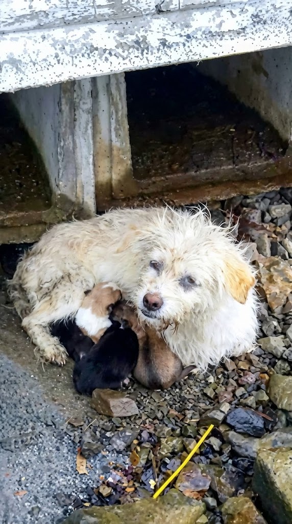 She was discovered in a neglected corner of a quiet neighborhood, her body frail and trembling from exhaustion. Yet even as her strength faded, Molly never loosened her hold on the tiny lives pressed against her. Curled tightly around her newborn puppies, she formed a living shield—protecting them with the last energy she had left.