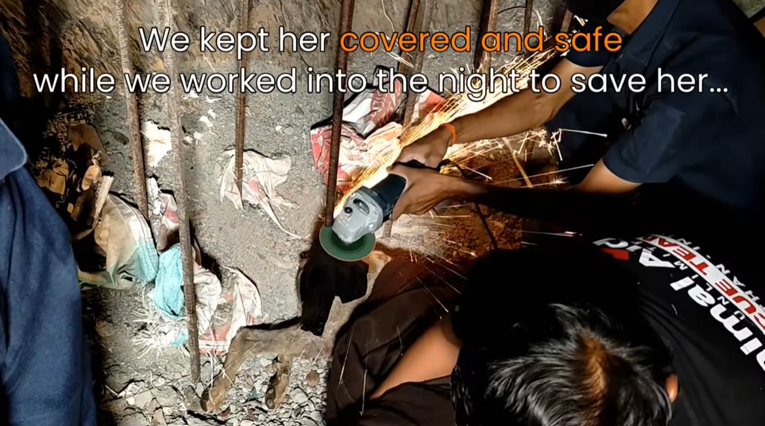 When the rescuers from Animal Aid arrived, they knew this wouldn’t be a simple rescue. They couldn’t just pull her free; the rod was firmly anchored. They had to call for industrial electric metal saws.