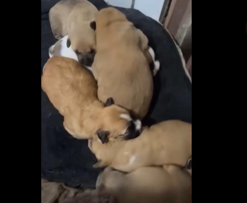 Six healthy puppies huddled against her belly.