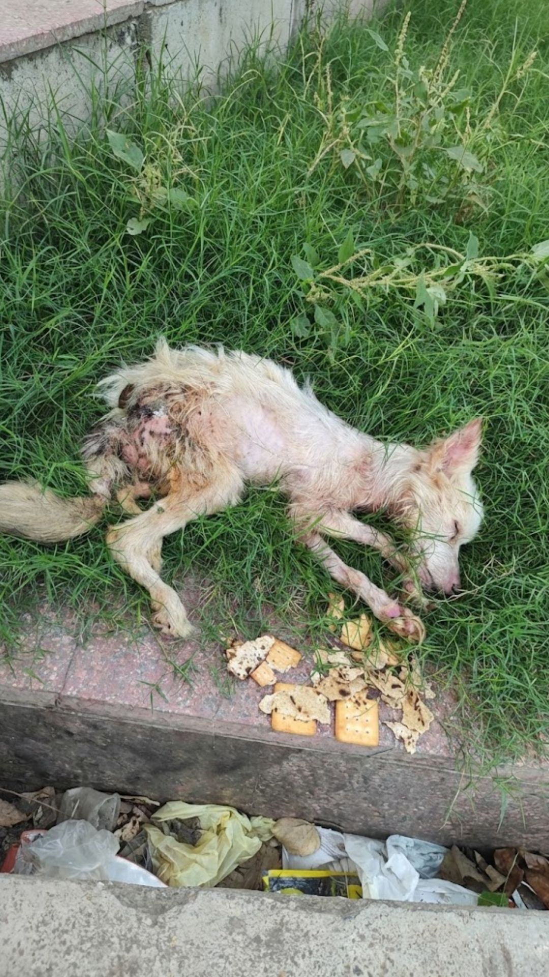 She was covered in blood and her own waste, the stench of neglect clinging to her matted fur. But it was her posture that shattered their hearts.