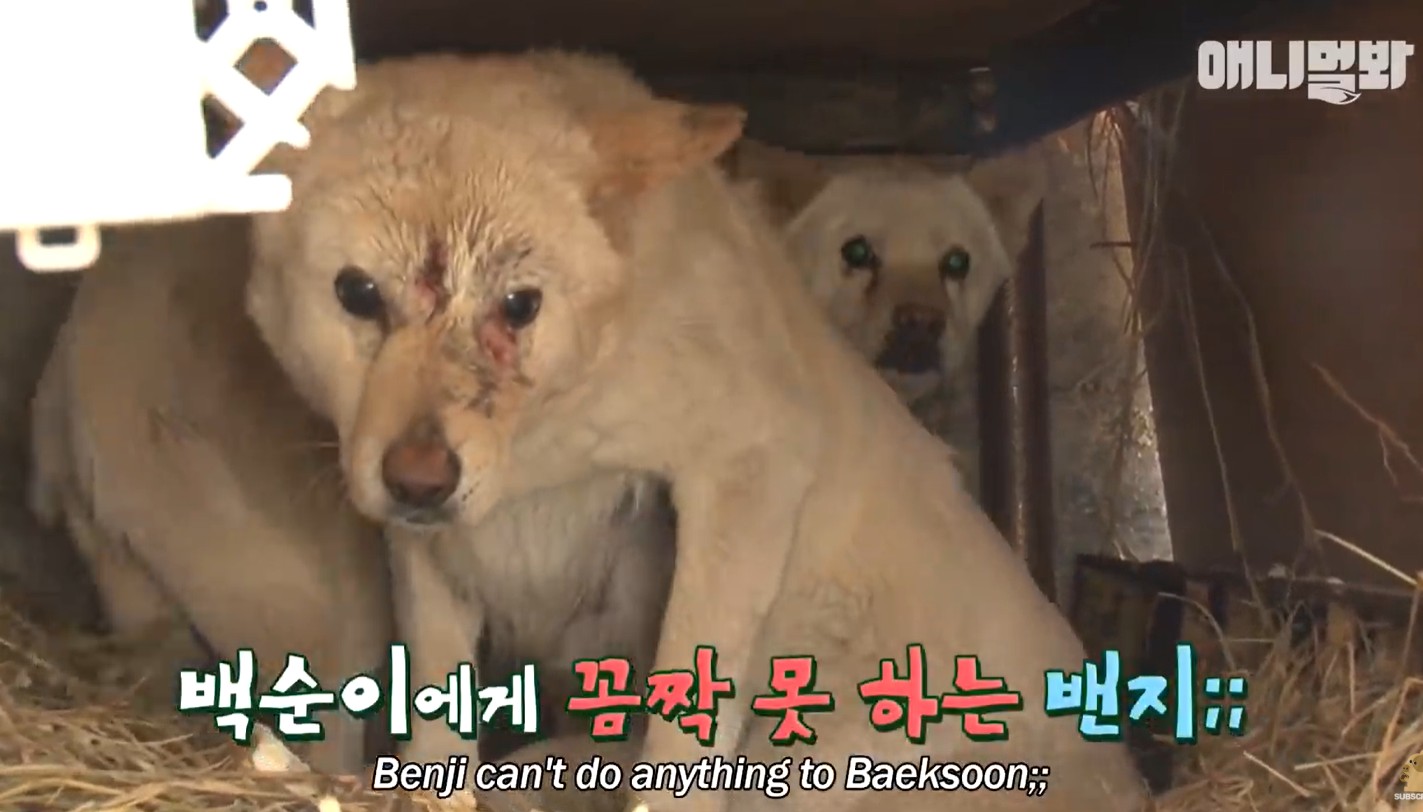 Benji, timid and heartbroken, tried to fight back. But Baeksoon was the “Alpha female.” She snapped, growled, and chased poor Benji out into the cold.