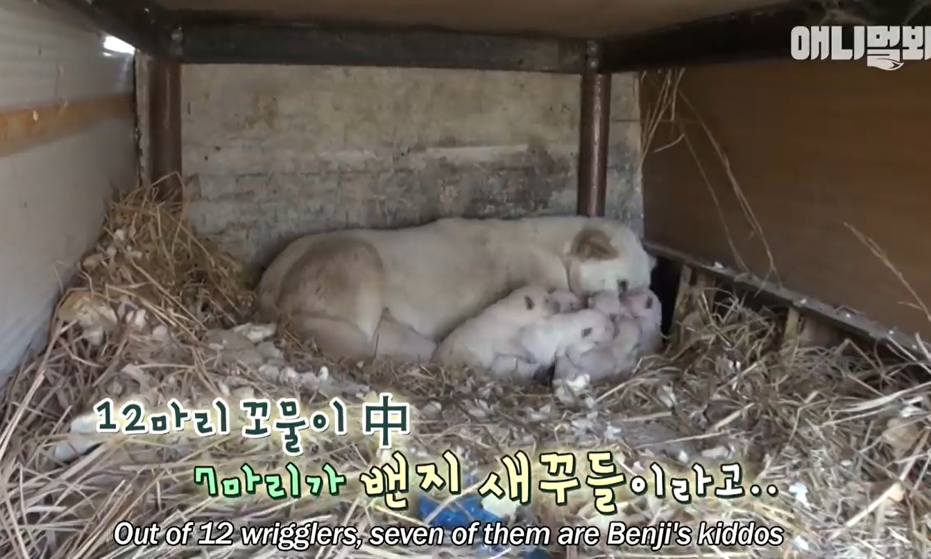 While Benji was resting, Baeksoon staged a hostile takeover. One by one, she dragged Benji’s puppies into her own house. She mixed them with her own babies, creating a massive pile of 12 wriggling pups.