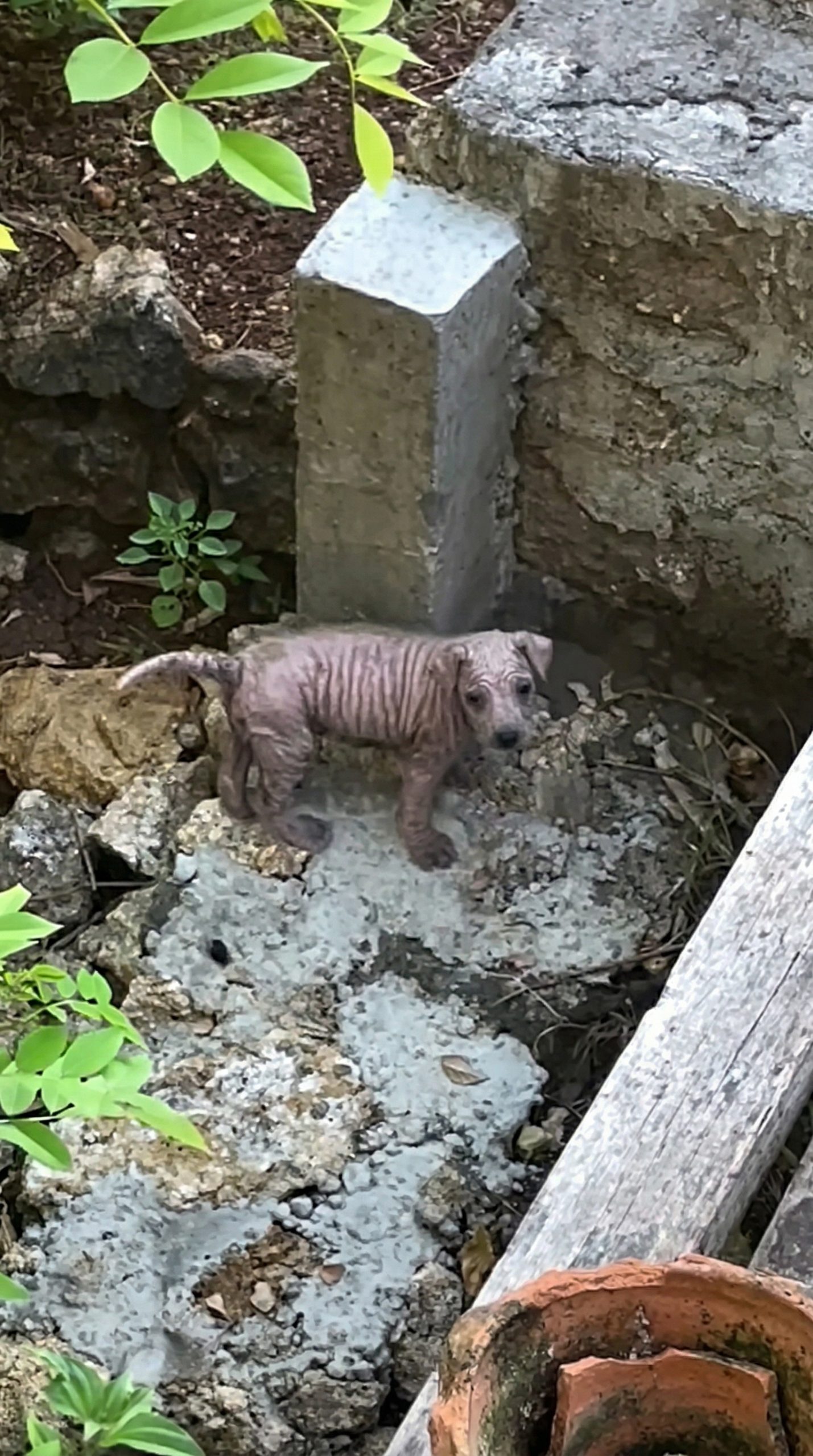 When a passerby peered through the branches, the sight was heartbreaking. There, curled in the dirt, was a tiny puppy. But she barely looked like a dog. She was completely hairless, her frail body nothing but fragile skin and deep wrinkles.