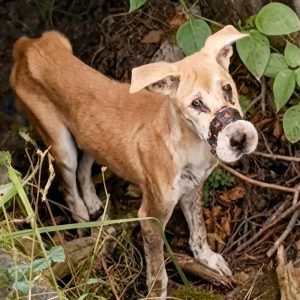 Without a second thought, the rescuer climbed down into the brush and gently scooped her up. Having no crate or blanket, they carefully placed the fragile pup into a small shopping bag, hanging it around their neck to keep her secure and close to their heart.