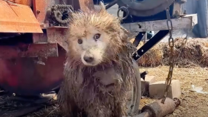 Sensing something was wrong, the rescuers decided to pay an unannounced visit. What they found shattered their hearts. The cheerful “angel” they once knew was gone. In his place was a terrified creature, tied tightly with a short rope in a filthy, mud-covered corner.
