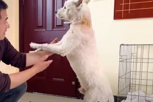 After weeks of medical care and emotional rebuilding, the day finally arrived: Discharge Day. The dog who was once unable to lift his head was now “dancing around” with excitement. He pulled his rescuers toward the exit, eager to leave the sterile walls of the clinic and start his new life.
