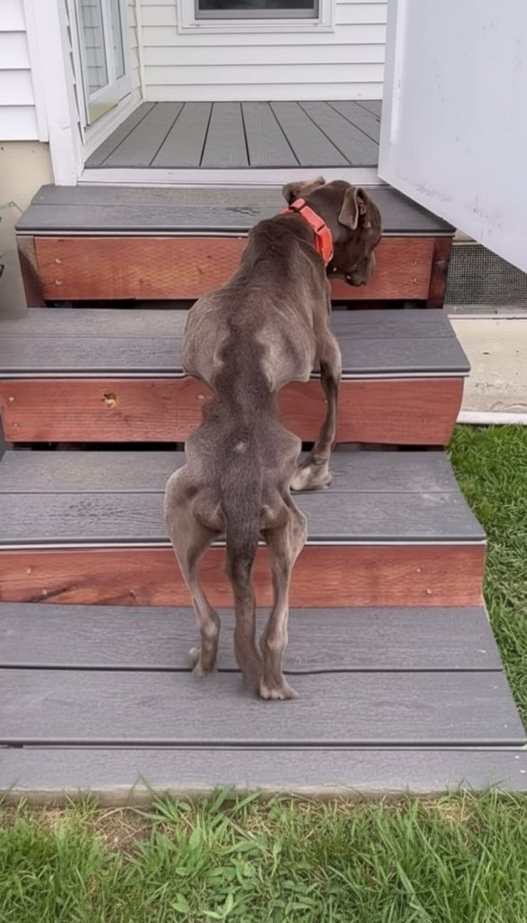 Rosie stood there in the quiet of the morning, a fragile silhouette of a dog. She was thin, her small frame trembling under the weight of a world that had been anything but kind. Every breath she took seemed like a deliberate choice, an exhausting effort to keep her heart beating just a little longer. Her eyes, wide and hollow, held a story of long-term hunger and a deep, soul-weary exhaustion. She stood on the threshold, hovering between the life she had fled and the uncertain future behind that door.