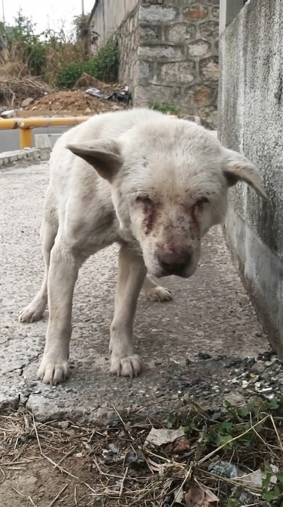 On a dusty road, a white dog moves with a staggering gait, his body so thin that every rib tells a story of neglect. He doesn’t avoid the cars, nor does he flinch when strangers approach. It’s as if he is looking through the world, searching for something—or someone—that no longer exists. To the neighbors, he is a “vagabond,” a shadow of a dog who seems to be crying even when he is silent.