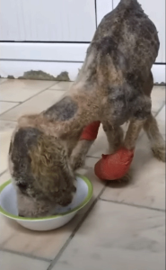 Her silence spoke more than a thousand cries for help ever could. She was thin to the point of transparency, her ribs tracing a painful map beneath fur matted with the dust of the road. Her movements were slow, burdened by an exhaustion that reached deep into her bones. This wasn’t the result of a single moment of misfortune; it was the heavy accumulation of days—perhaps weeks—of being forgotten.
