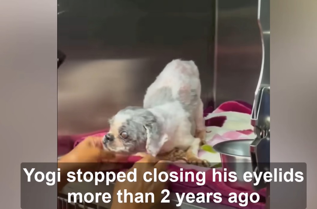 Because he had been neglected for so long, a thick layer of debris had formed over his eyes, damaging the corneas. For two years, Yogi had been unable to close his eyelids.
