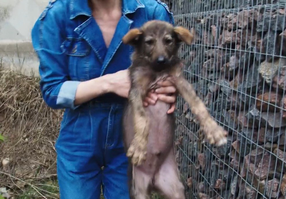 As the rescuers approached, the reality of the puppy’s condition became heartbreakingly clear. He was almost entirely hairless, his skin raw and thickened from neglect. His back bore the marks of an old injury, and his posture was one of total defeat.