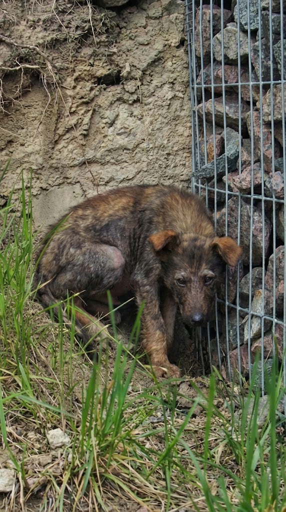 He stood alone in the middle of a barren patch of land, looking smaller than the world around him. He didn’t bark, and he didn’t run. He simply waited, his tiny body a map of suffering that no puppy should ever have to carry.