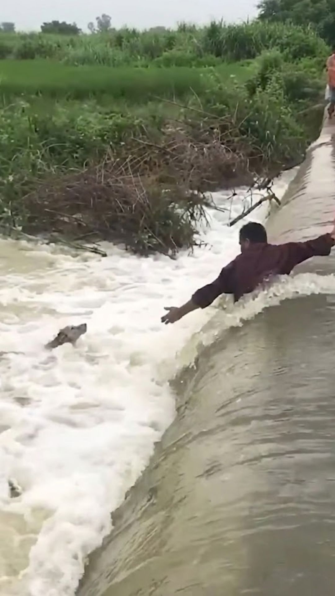 On a small, submerged bridge nearby, a man stepped forward. The situation was terrifying. The floodwaters were rushing over the bridge, flowing perpendicular to where he stood. The concrete was slippery, invisible beneath the brown sludge.