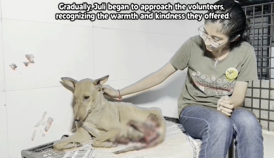 It took time and immense patience to locate her. When they finally found her, the volunteers didn’t rush in with nets or loud voices. Instead, they set up a makeshift feeding station and sat quietly nearby for hours. They wanted Juli to learn the “scent of kindness.” Slowly, the blind dog began to recognize the warmth of their presence. Sensing that these humans were different, Juli eventually approached them, allowing herself to be touched by hands that were meant to heal.