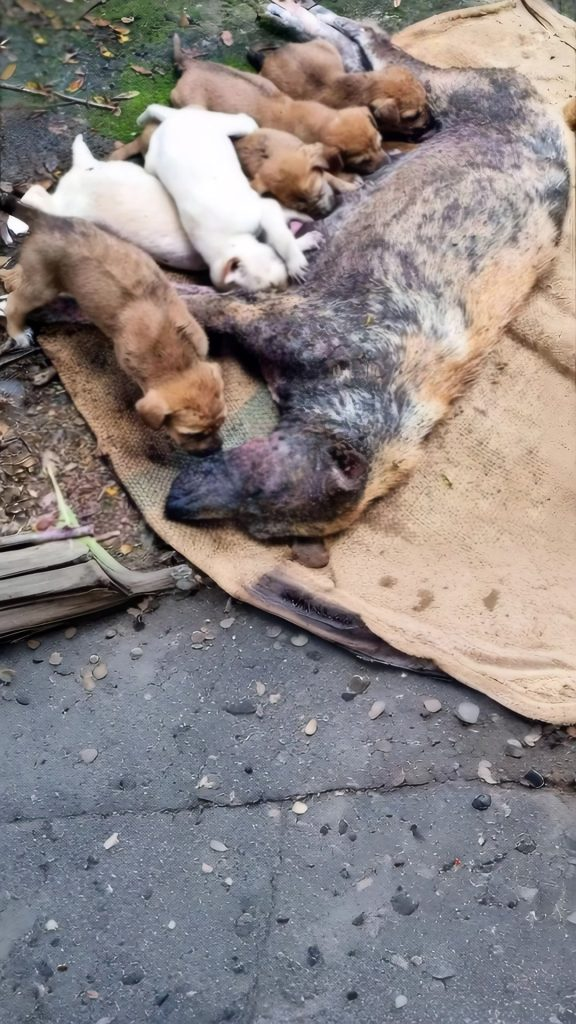 Every breath she drew was a testament to her devotion. Every time she shifted her weight to keep her babies warm, it was a labor of pure love. Within that small, fragile family unit, there was no room for despair—only the fierce, burning instinct to survive. While the world outside sped by, unaware and unboding, this mother stayed steadfast, nursing her pups and offering them the very last of her dwindling strength.