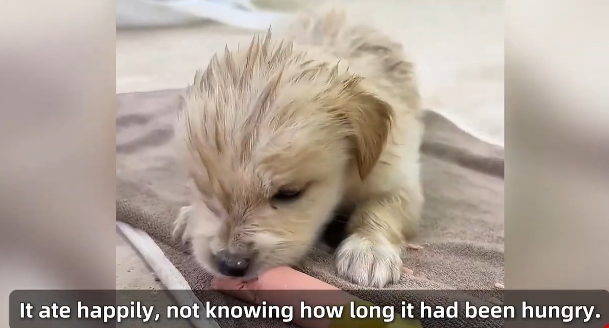 The rescue was only the beginning. The uncle dried the puppy off and made a quick stop at a supermarket. He placed the little one in an eco-friendly bag—a small, makeshift nest—and bought some sausages to ease the hunger that had clearly been gnawing at the pup for a long time.