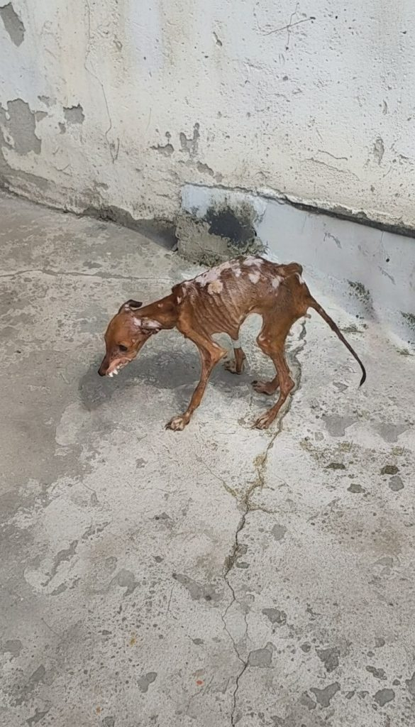 Mangito was found where the world had seemingly forgotten him, his body so hollowed out by hunger that he barely occupied the space he was in. He wasn’t moving, wasn’t barking, and wasn’t searching for food anymore. His skin was a map of long-term neglect, and his eyes held a hollow exhaustion that suggested survival had long since felt like a losing battle. He had reached that fragile point where the body begins to shut down, waiting for a conclusion that he was too tired to fight.