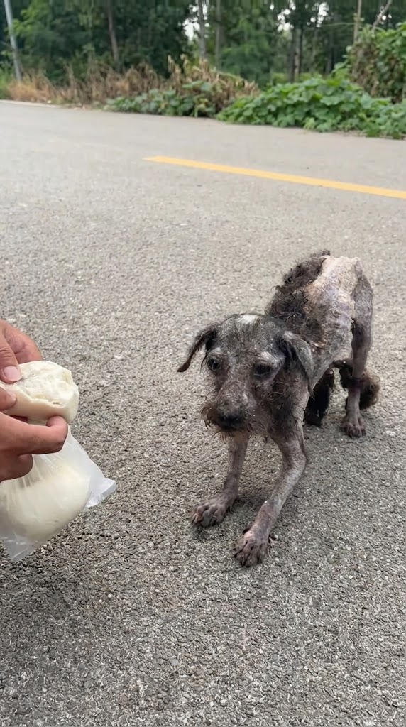 Along a dusty roadside, a skinny stray dog wandered aimlessly. Her fur was a chaotic mess, matted and tangled into heavy clumps that looked more like rags than hair. She was caught in a heartbreaking tug-of-war between her instincts: her heart wanted to be close to the people passing by, but her past had taught her to be afraid.
