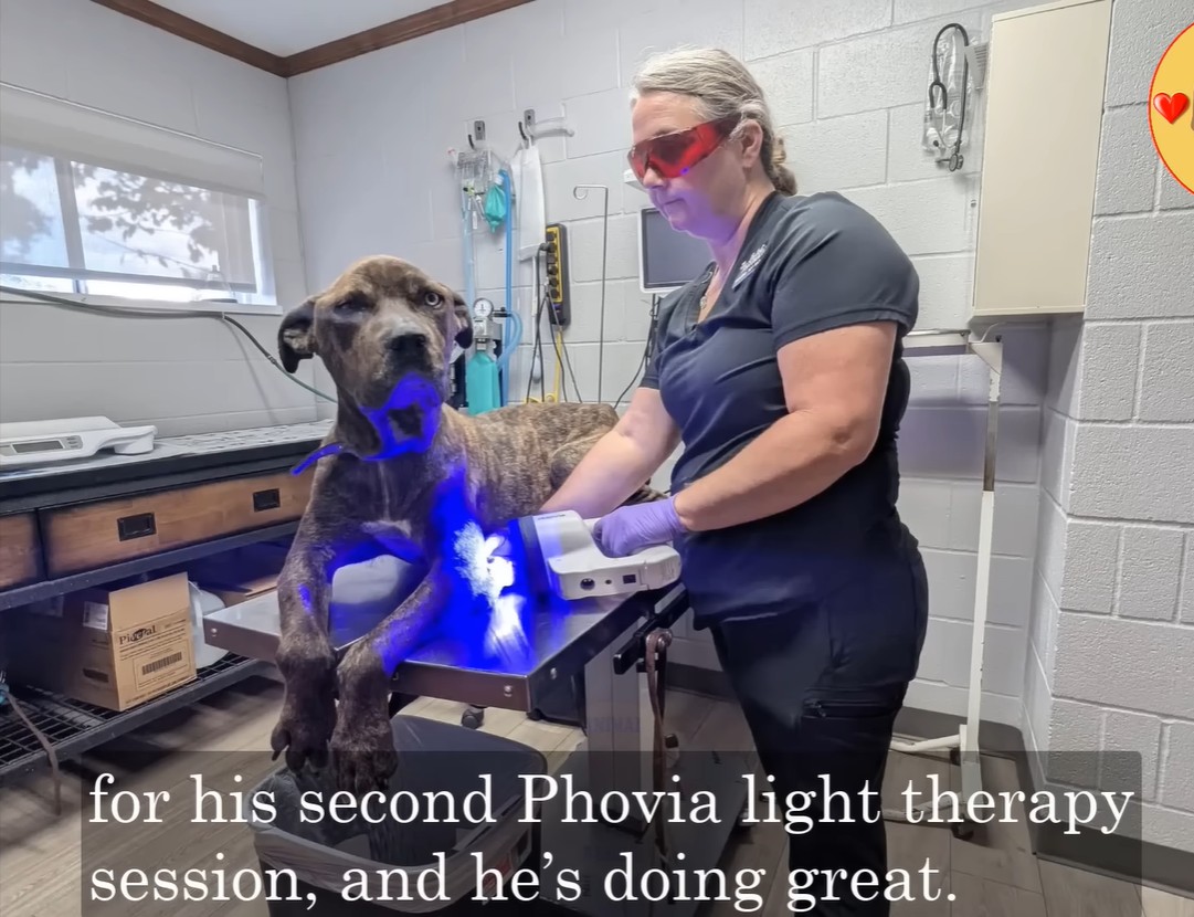He underwent Phovia blue light therapy to accelerate his tissue healing, surrounded by clinic staff—Sabrina, Rachel, and Ashley—who showered him with extra treats and endless love.