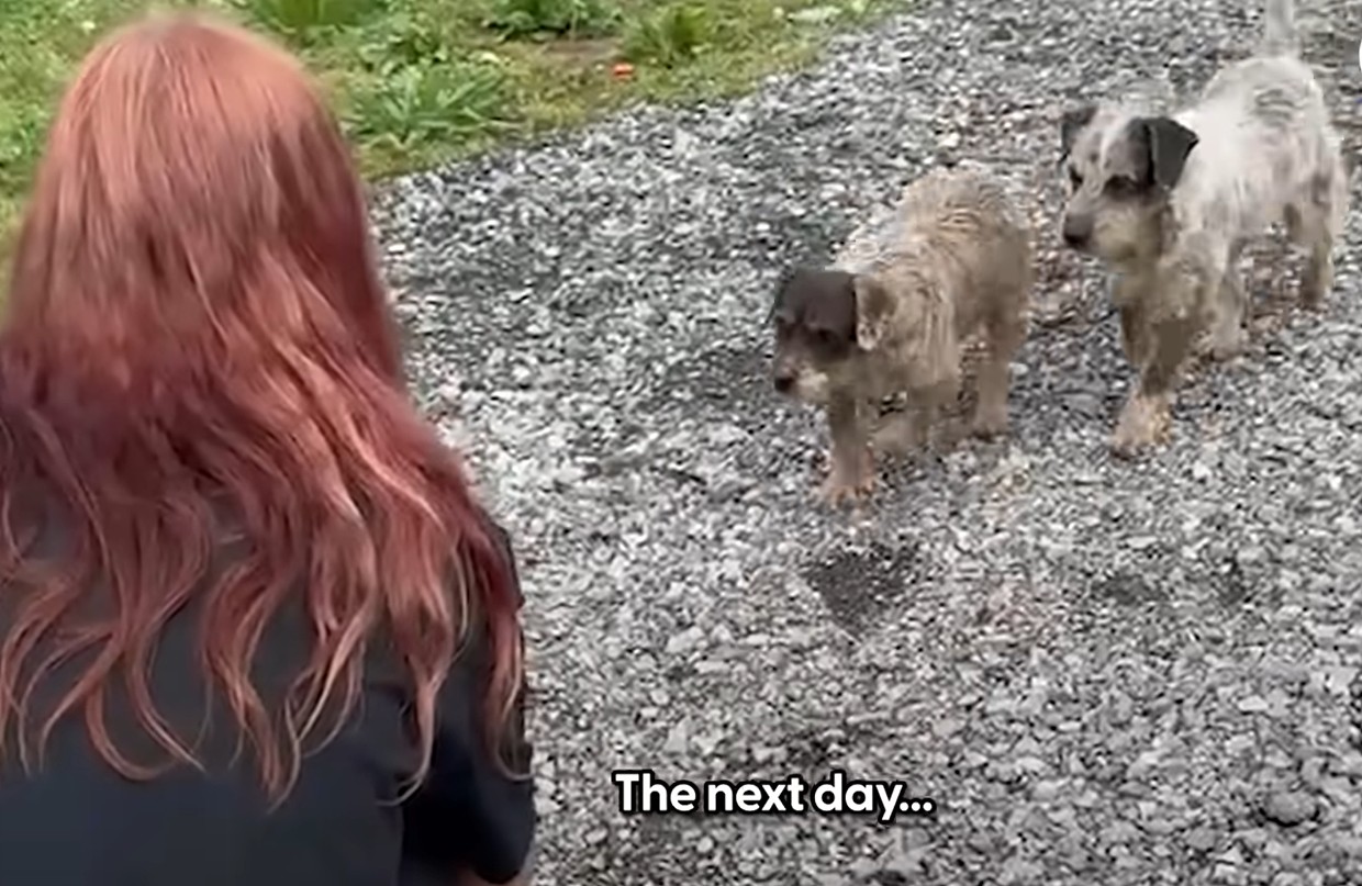 These two dogs hadn’t experienced much human kindness in their lives. They were painfully skittish, their bodies trembling at the slightest sudden movement. Hunger forced them to creep close enough to snatch small bites of food straight from Audray’s hands, but the fear was always stronger than the hunger.